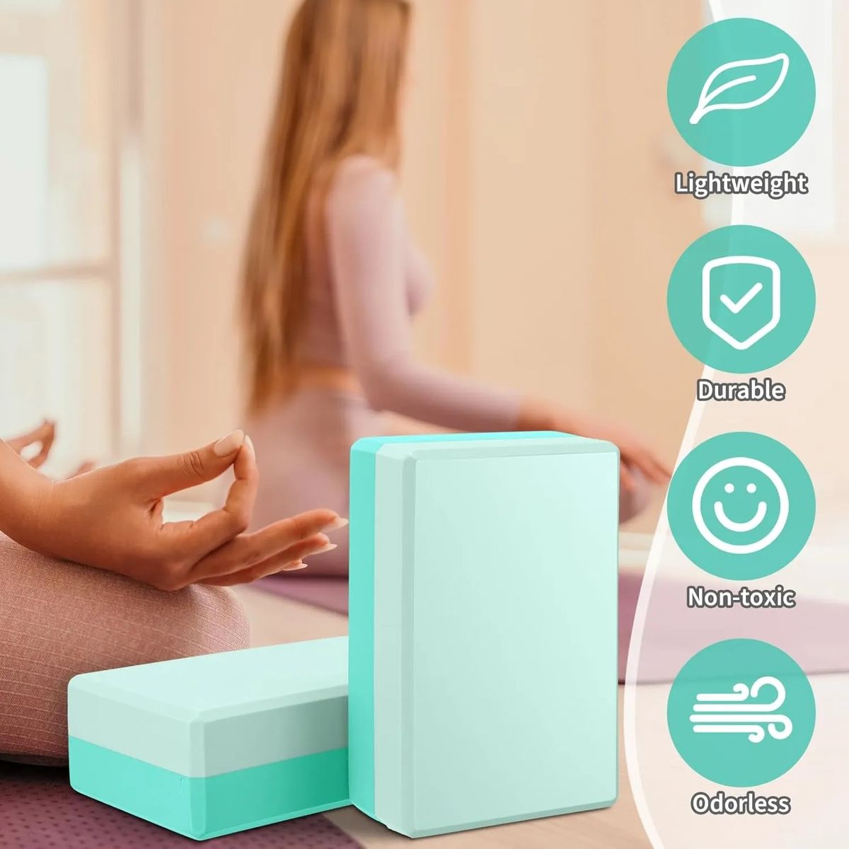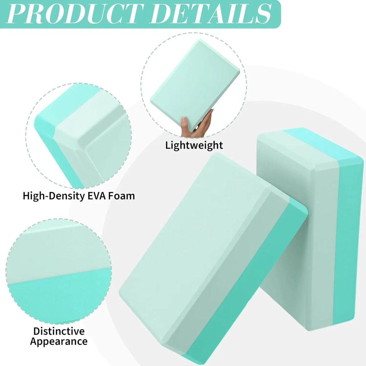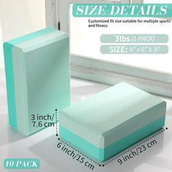 Our yoga blocks are made from 100% EVA Foam. EVA foam is recyclable and 100% non-toxic. Free of chlorides, heavy metals, phenols and latex. Yoga bricks enable you to extend, support and deepen your stretches while also working to increase range of motion. Doing more yoga can slso make your body healthier.Perfect for all fitness levels, especially the yoga beginners, can help to reduce the risk of pulled muscles and other injuries.These lightweight and supportive foam blocks are constructed of a durable foam with a nonslip surface and beveled edges for easy gripping. The yoga accessory blocks can be gently wiped down with a wet towel, or a mixture of soap and water. They can be dried with a towel or simply left to air dry. 9"L x 6"W x 3"H
